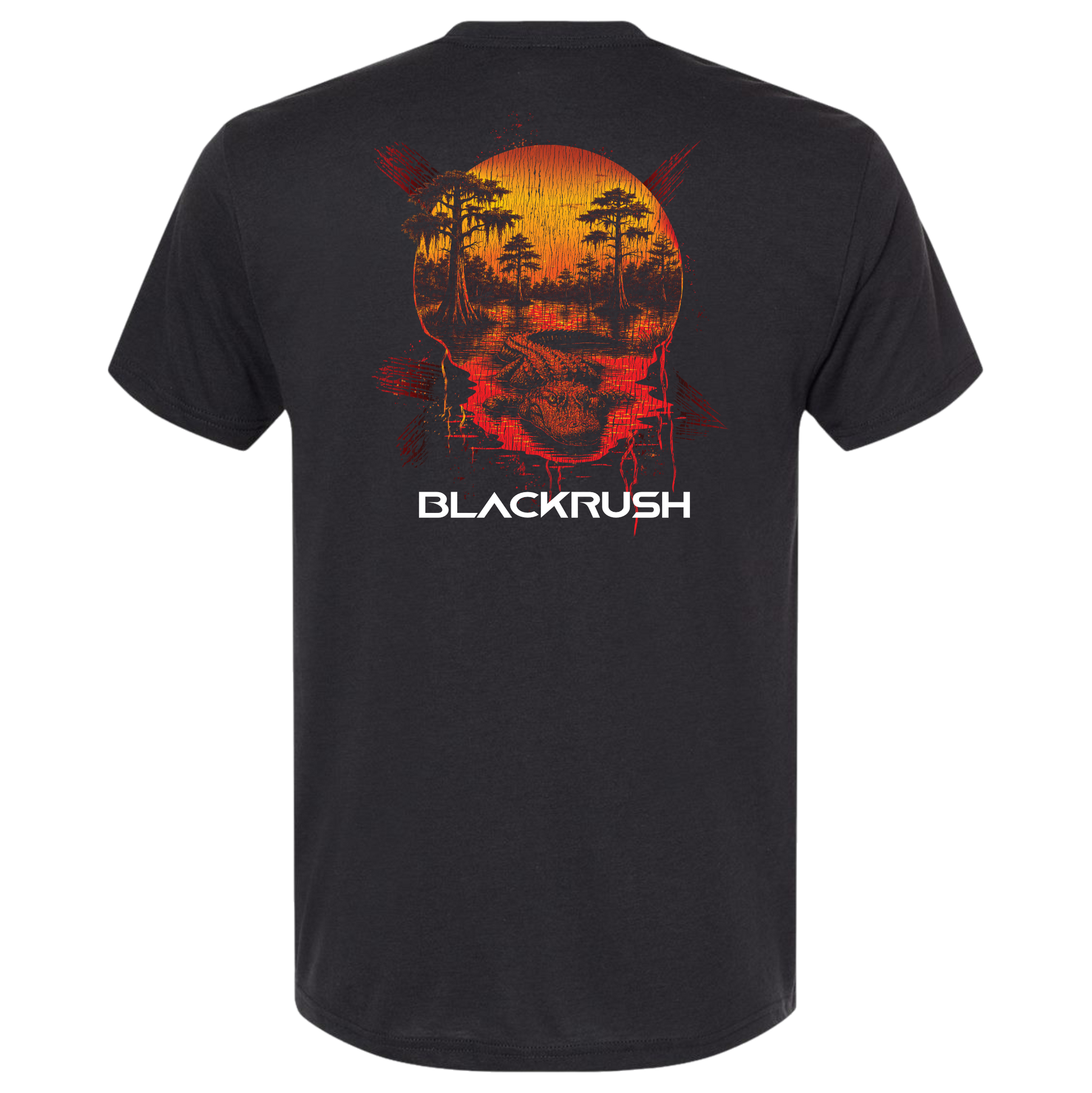 The Alligator Sunset Second Edition, has a cleaner feel and sharper detail and vintage look. The layout keeps the focus on the cypress trees, still water, and forward-facing gator — framed by a sun that fades into deep orange.