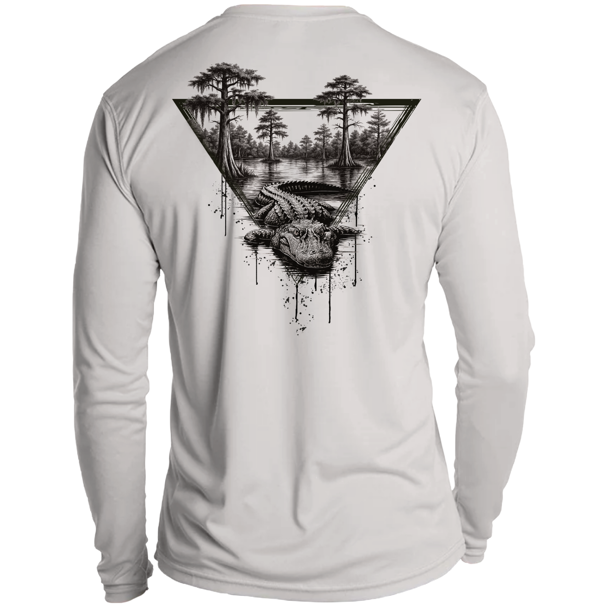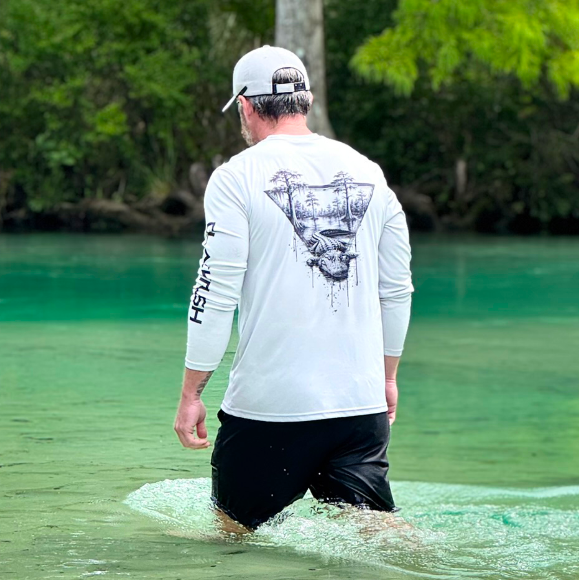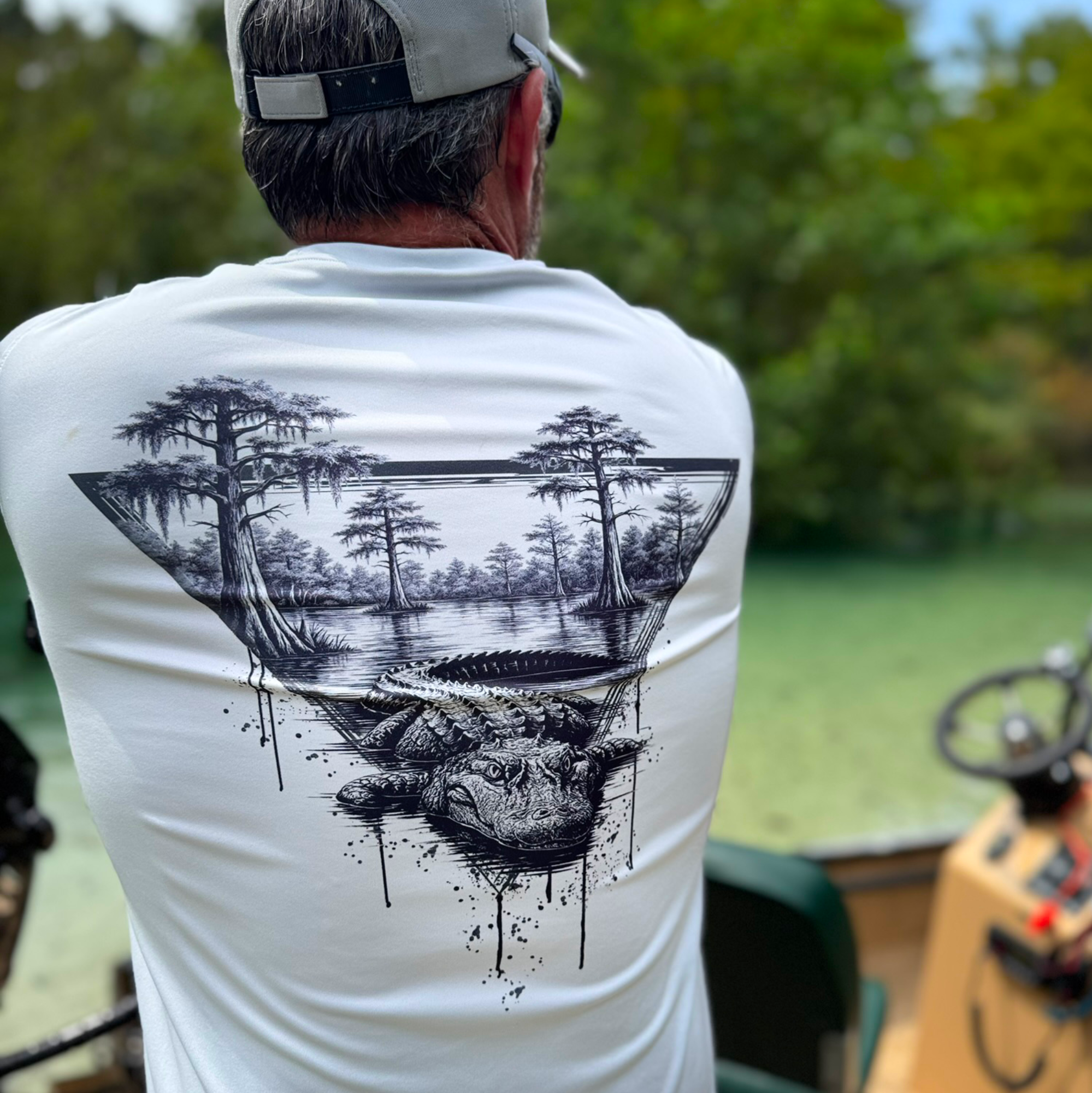 The Gator Swamp Pearl Grey Performance - Second Edition. Featuring a Cypress Swamp, menacing Alligator, and an Inking Style Art design that brings this piece to life.
